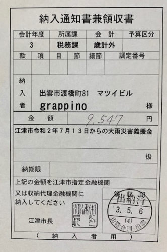 grappino店頭募金箱にて皆様からお預かりいたしました江津市大雨災害への義援金を納付いたしましたのでご報告させていただきます。